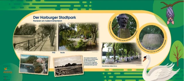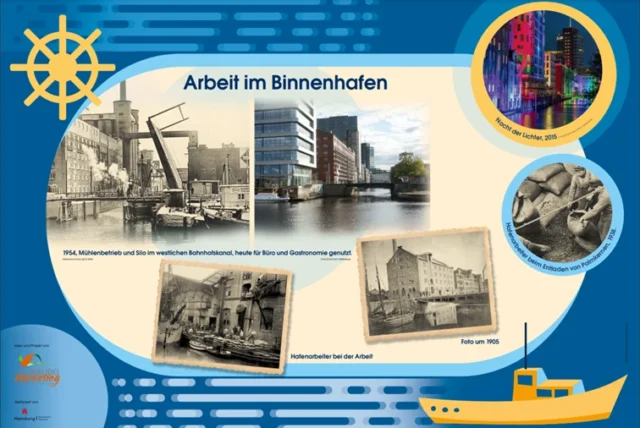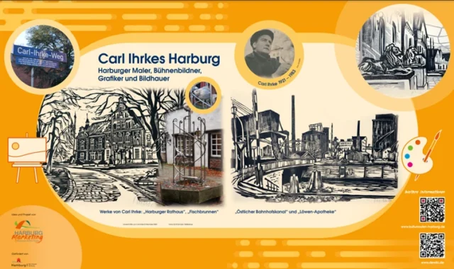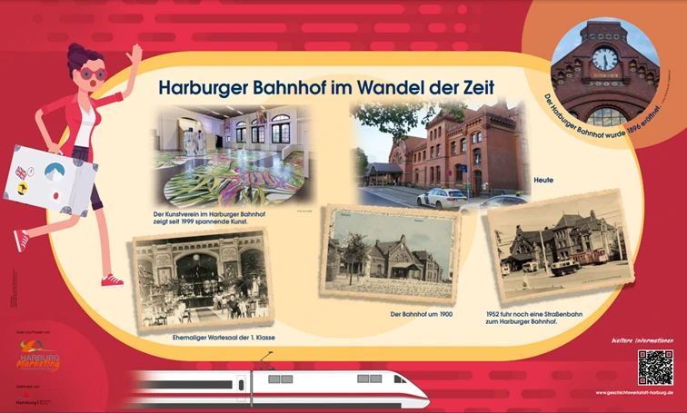 Die Harburger Schaufenstergalerie am ehemaligen Karstadt-Gebäude erzählt Geschichten über die Vergangenheit, stellt Projekte der Gegenwart dar und lässt die innovative Zukunft Harburgs erahnen. Sie fungiert als Wegweiser für Bürger:innen, Besucher:innen und Tourist:innen, die den Bezirk (neu) erleben möchten. Mit beeindruckenden Bannern, die teils bis zu 6 x 2,50 Meter groß sind, werden insgesamt 25 Themen präsentiert. Diese reichen von bekannten Wahrzeichen wie dem Harburger Bahnhof, der Lüneburger Straße, dem Wochenmarkt am Sand, dem Binnenhafen und den Harburger Rathäusern – die im Laufe der Zeit an drei verschiedenen Standorten standen – bis hin zu Geheimtipps wie dem Kunstpfad und dem Audio Walk „Hamburg can dance“. Auch Transformationen von Gebäuden und Plätzen werden beleuchtet, darunter die ehemalige Gummiwarenfabrikhalle, die heute die Kunstsammlung Falckenberg beherbergt oder der ehemalige Wartesaal des Bahnhofs, der inzwischen als Kunstverein dient.